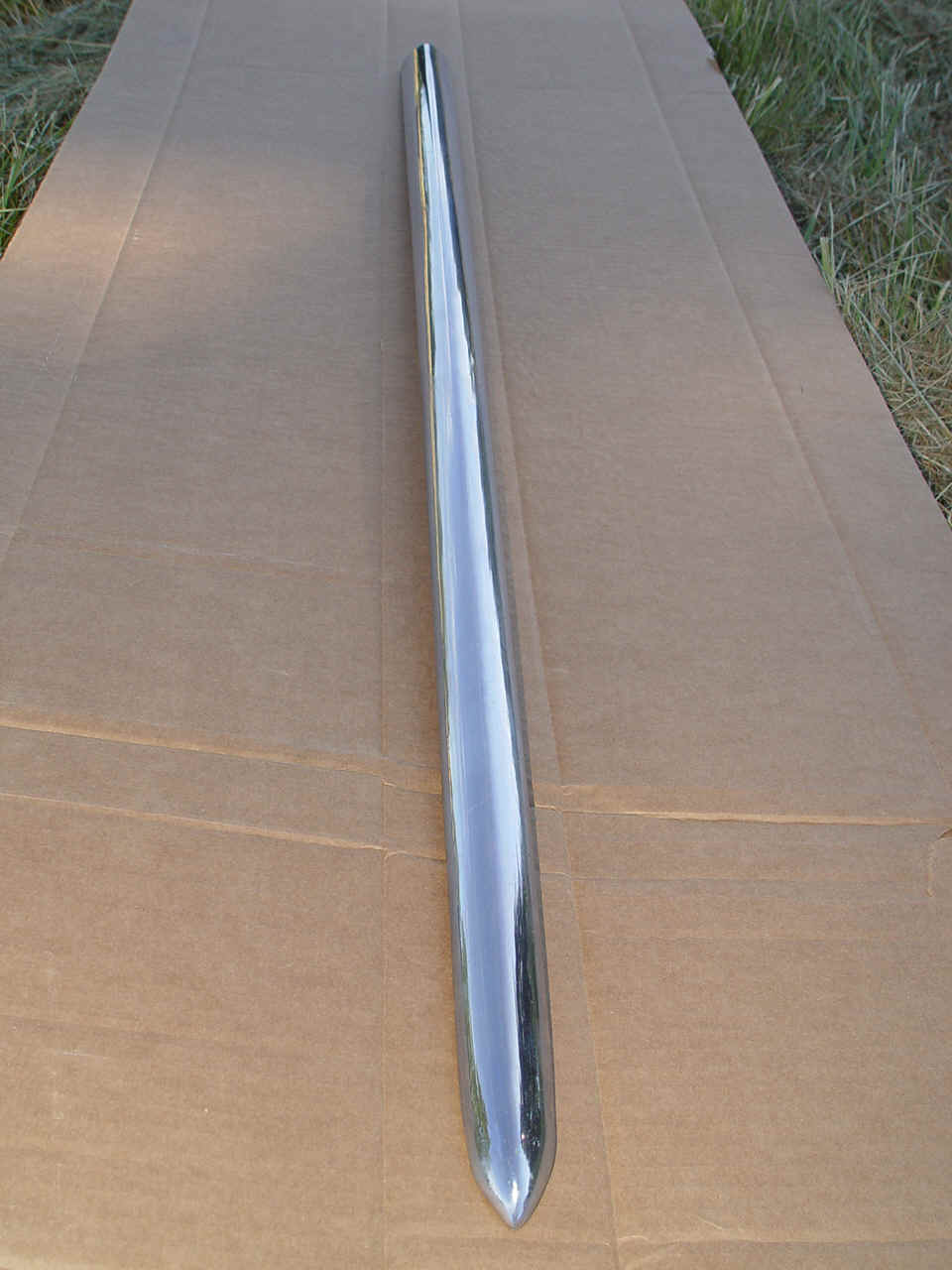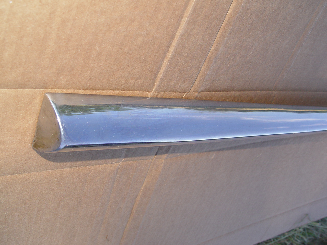 A very fine piece. No dents, dings, scrapes. Just real nice chrome. Suitable for a show car. Proper curviture for mounting on the quarter fender.