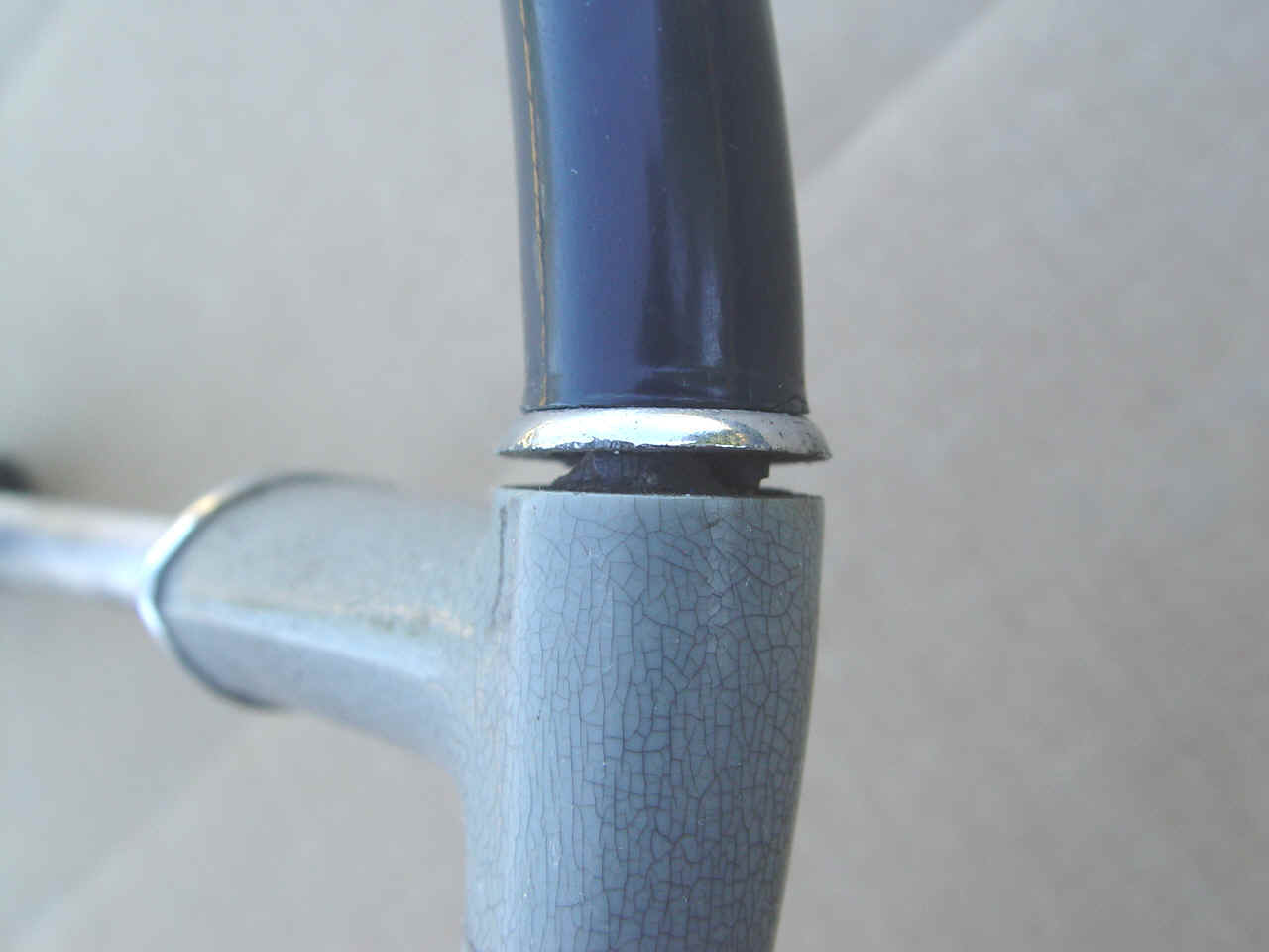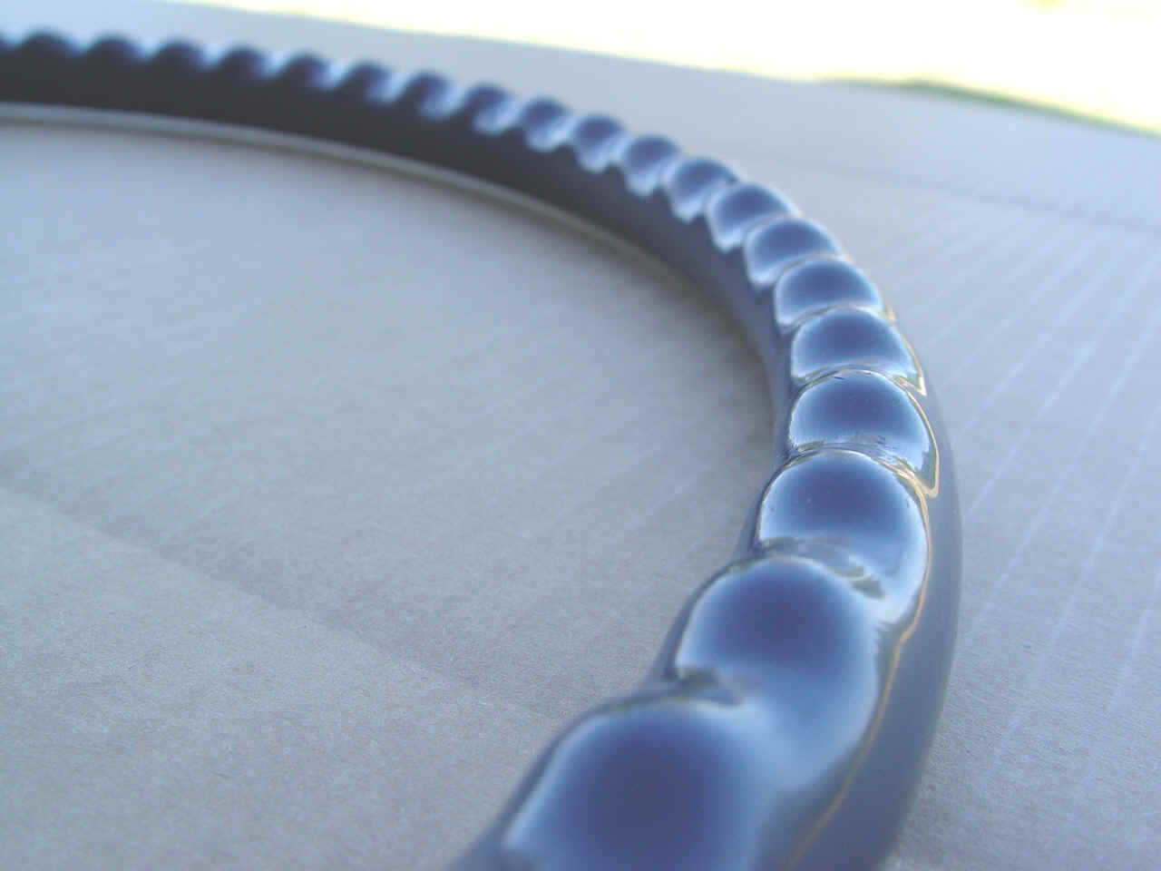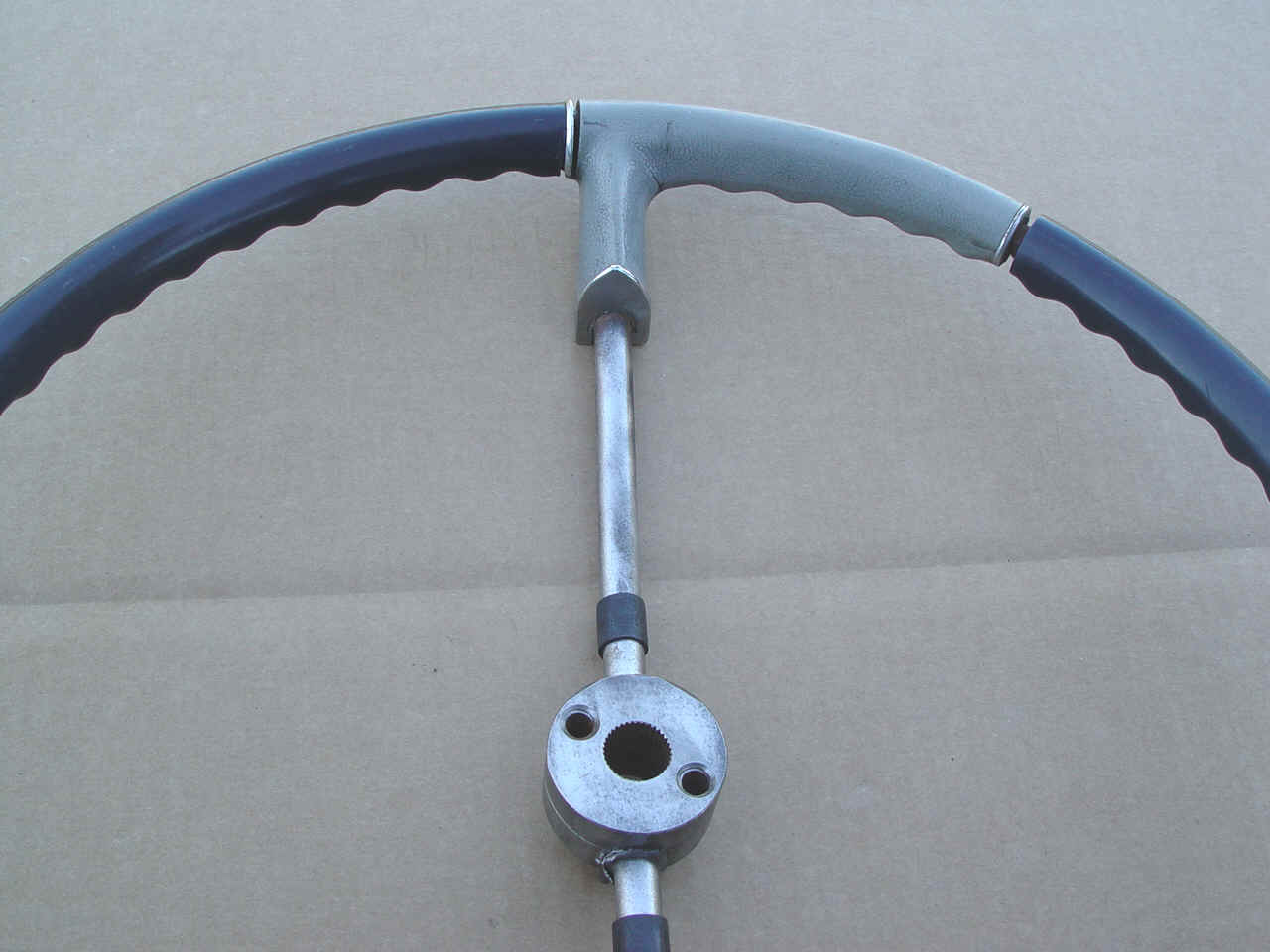 A very usable steering wheel. Feels very smooth, no loose pieces. Could use some filler where the dark blue has shrunk away from the chrome rings. Can be painted with polyeruthane paint per your requirements. As you can see, our camera can magnify any little flaws we found.