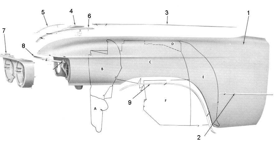 1. Fender .......(without trim, etc., nice and straight, will -- -- 325.00 -- -- .............need 6" x 10" patch panel in rear lower flat portion) 8. Eyebrow molding ........(not currently available) -- -- -- -- -- Left fender forward lower molding -- -- -- -- 35.00 Right fender forward lower molding -- -- -- -- 35.00 Eyebrow molding clips .......(each) -- -- -- -- 12.00 Fender emblem -- -- -- -- 35.00 Monitor Light Assembly See Pictures -------> 6. Main base piece -- $75.00 $95.00 $125.00 $175.00 5. color inlay $38.00 $55.00 4. Monitor light chrome cap $38.00 $48.00 $65.00 amber lens $22.00 $28.00 bulb/ socket/ wire $28.00 $38.00 stainless steel aft finish piece $22.00 $28.00 2. Fender body side molding -- -- -- 95.00 125.00 9. Fender wheel opening molding -- -- 100.00 125.00 150.00 Left wheel opening molding -- -- 75.00 95.00 125.00 Featured Item