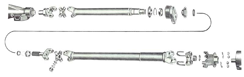 Driveline center support.....(new reproduction) -- -- -- -- 150.00 Driveline center support.......(good, used) 100.00 Bearing.......(good, used) 20.00 Third member ........(air conditioned car or non A.C. car?) -- -- -- -- 195.00 Third member plug -- -- -- -- 8.00 Rear lower control arm -- -- -- -- 125.00 Illustration of drive shaft If a part doesn't have a price filled in yet, It doesn't mean we don't have that item.