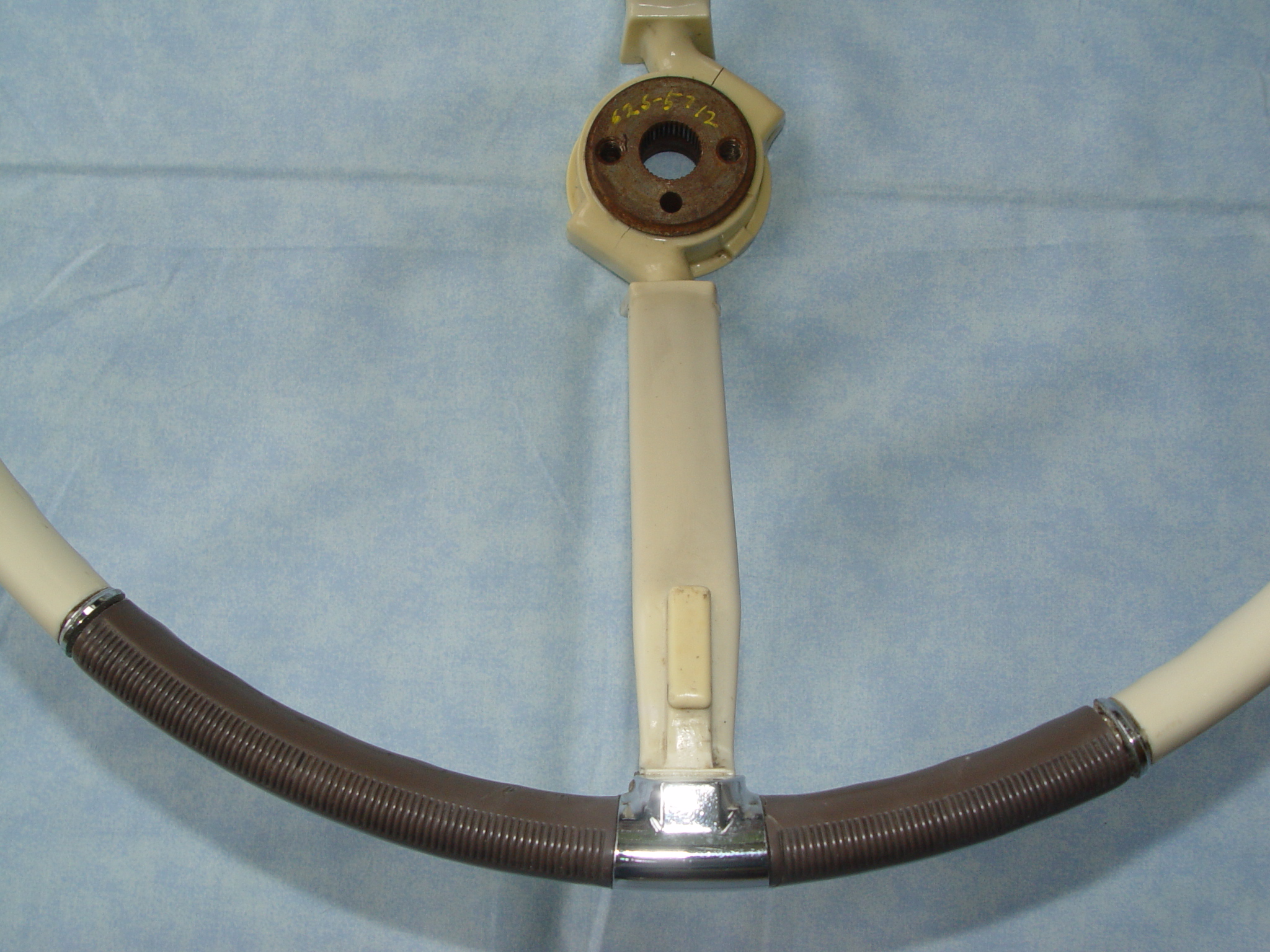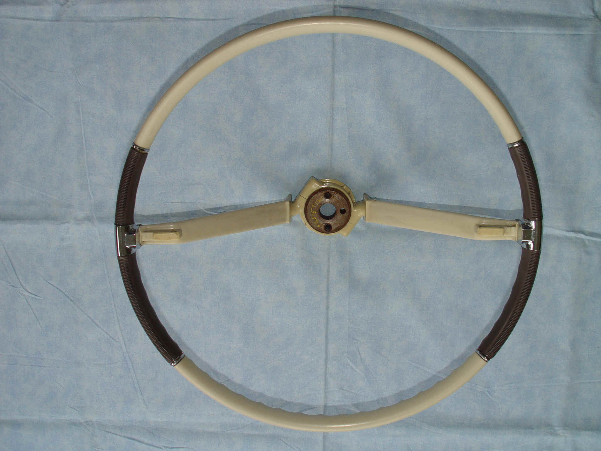 Ivory and brown Rare original wheel. Nice chrome accents. Absolutely minimal aging. No cracks, scuffs, dings or wear spots in visual areas. My camera does such a superb job of very close-up pictures that it tends to exagerate the size of the little cracks. Don't want these pictures to over-emphasis these miniscule fissures. These can easily be repaired and color can be changed to your needs, but I wanted to expose any flaws. I pulled this out of 25 year storage. The grips feel like brand new. Any spots you see just need a little better cleaning. Where are you going to find a nicer 50 year old original steering wheel?