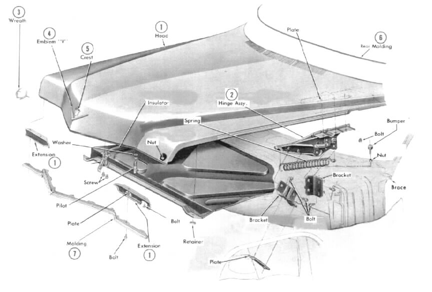 1. Hood ...........(without trim and emblem) -- -- $195.00 $250.00 $295.00 2. Left hood hinge assembly -- -- -- -- 65.00 - Right hood hinge assembly -- -- -- -- 65.00 3. Fleetwood hood wreath -- -- -- 38.00 48.00 4. Hood "V" emblem -- -- 45.00 55.00 65.00 5. Hood crest -- -- 45.00 55.00 65.00 6. Hood rear molding -- -- -- -- 65.00