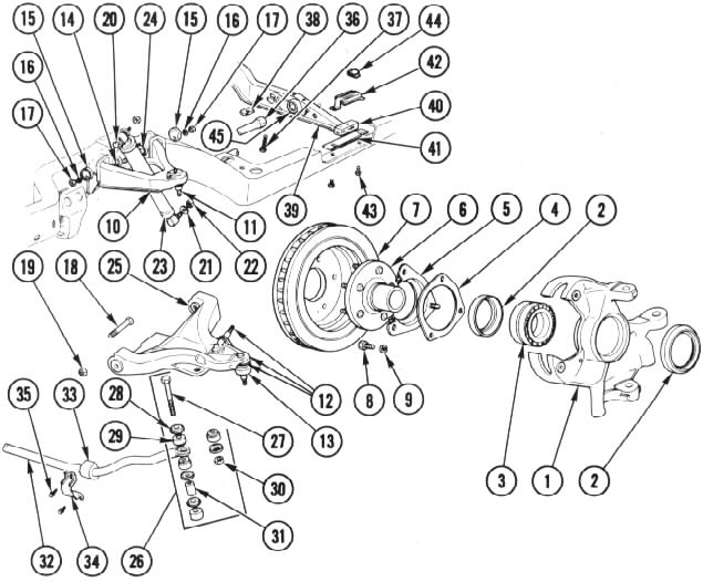 Front wheel bearing ......(each, nice used) -- -- -- -- 125.00 Front hub .......(carefully inspected by machine shop for -- -- -- -- 150.00 .......tolerance) Front rotor/knuckle/hub/bearing .......(left side only -- -- -- -- 650.00 ........available) Front upper control arm -- -- -- -- 65.00 Front upper control arm with good ball joints/bushings -- -- -- -- 95.00 Front lower control arm -- -- -- -- 75.00 Front lower control arm with good ball joints/bushings -- -- -- -- 110.00 Front torsion bar -- -- -- -- 125.00 Front torsion bar adjusting nut and bolt -- -- -- -- 58.00 Front stabilizer bar -- -- -- -- 45.00 Illustration of front suspension Rear ride leveling shocks .......(nice used, each) -- -- -- -- 95.00 Brakes