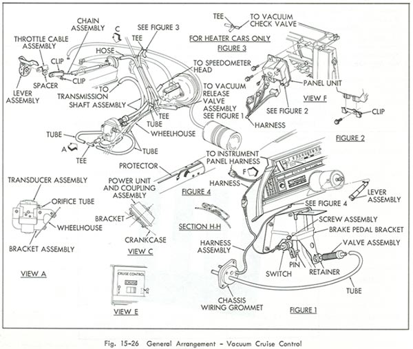 1. Turn signal arm with cruise button and wire ......(state color) -- -- $55.00 3. Vacuum release valve assembly -- -- 22.00 5. Stop light switch -- -- 22.00 8. Dash switch and wire harness -- -- 58.00 9. Dash switch escution -- -- 20.00 10. Cruise transducer ......(main controller) -- -- 125.00 17-19. Control chain -- -- 22.00 21. Speedometer cable ........(transducer to speedometer head) -- -- 32.00 23. Speedometer cable ........(transducer to transmission) -- -- 35.00 24. Power unit .......(servo) -- -- 58.00 -- Cruise wire harness including hold terminal resistance wire -- -- 65.00 ........(should read 40 ohms) Illustration for cruise system