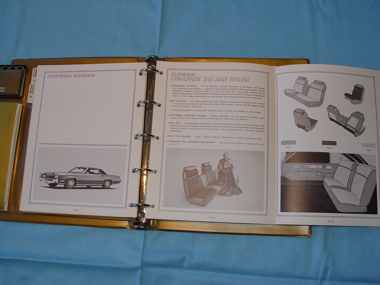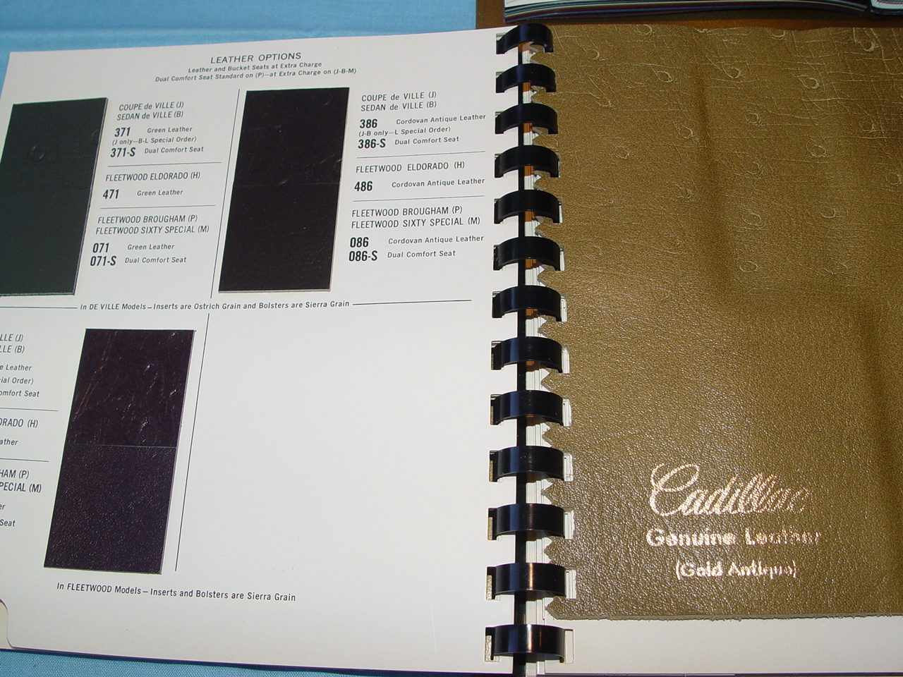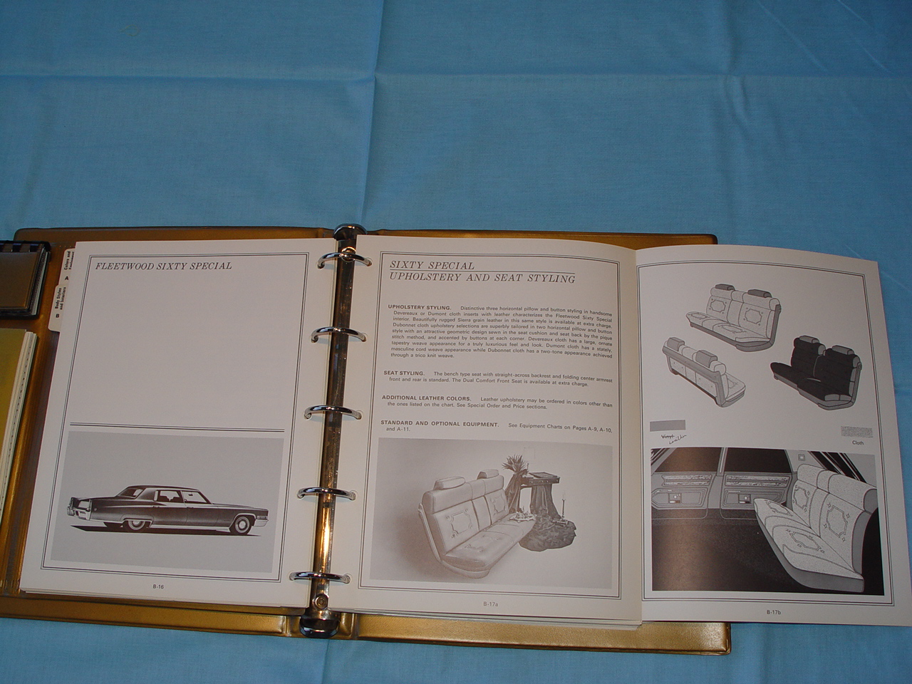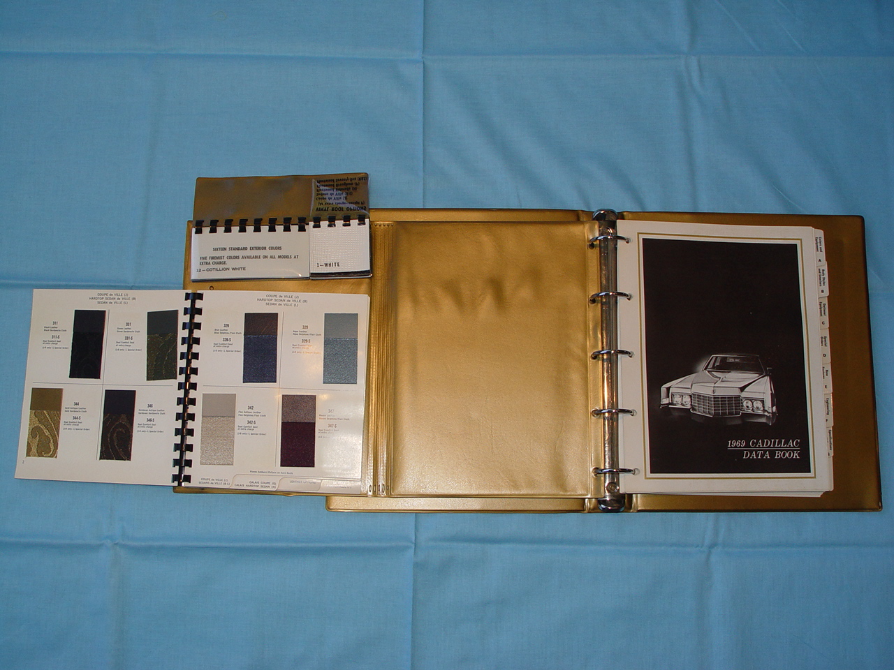 This is THE Cadillac Salesman's complete data book. Includes all information about the new 1969 Cadillacs plus the full exterior color samples and interior upholstery samples. Data book has 142 pages of which 12 are fold outs. Exterior samples: Includes 21 exterior paint colors, 6 vinyl top colors which are Elk grain material and 5 convertible top colors. Interior samples: including Ostrich grain, Dubonnet cloth, Devereaux cloth and other samples. This is from a collection that was owned by a district sales manager for Cadillac Motor Car Division. Brand new, it doesn't look like it has ever been used.
