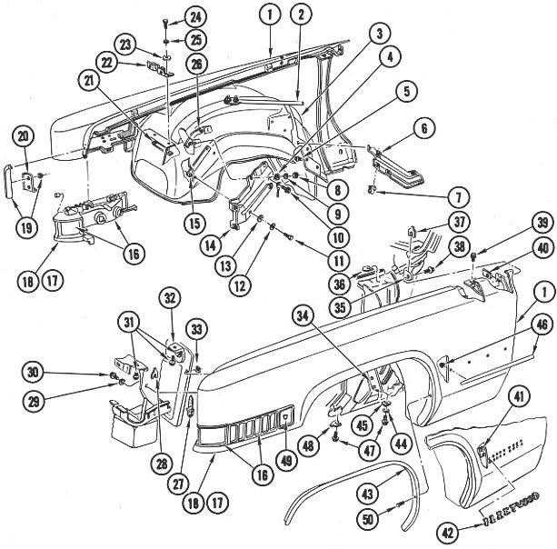 Left fender .....(without trim or lights, best we have -- 240.00 295.00 350.00 395.00 .........will need small patch panel in rear lower, otherwise ......... really nice, $175.00) Right fender .....(without trim or lights, best we have -- 240.00 295.00 350.00 395.00 .........will need small patch panel in rear lower, otherwise ......... really nice, $195.00) 27. Fender front ornament -- -- -- 38.00 48.00 Fender inboard vertical molding -- -- -- 28.00 38.00 46. Fender body side molding -- 45.00 55.00 75.00 95.00 43. Left front wheel opening molding -- 45.00 55.00 75.00 100.00 43. Right front wheel opening molding -- 60.00 75.00 95.00 125.00 Power antenna ......(nice used original, price without $35.00 -- -- -- -- 150.00 ...........core charge) Power antenna fender bezel -- -- -- -- 25.00 Illustration of fenders Hood
