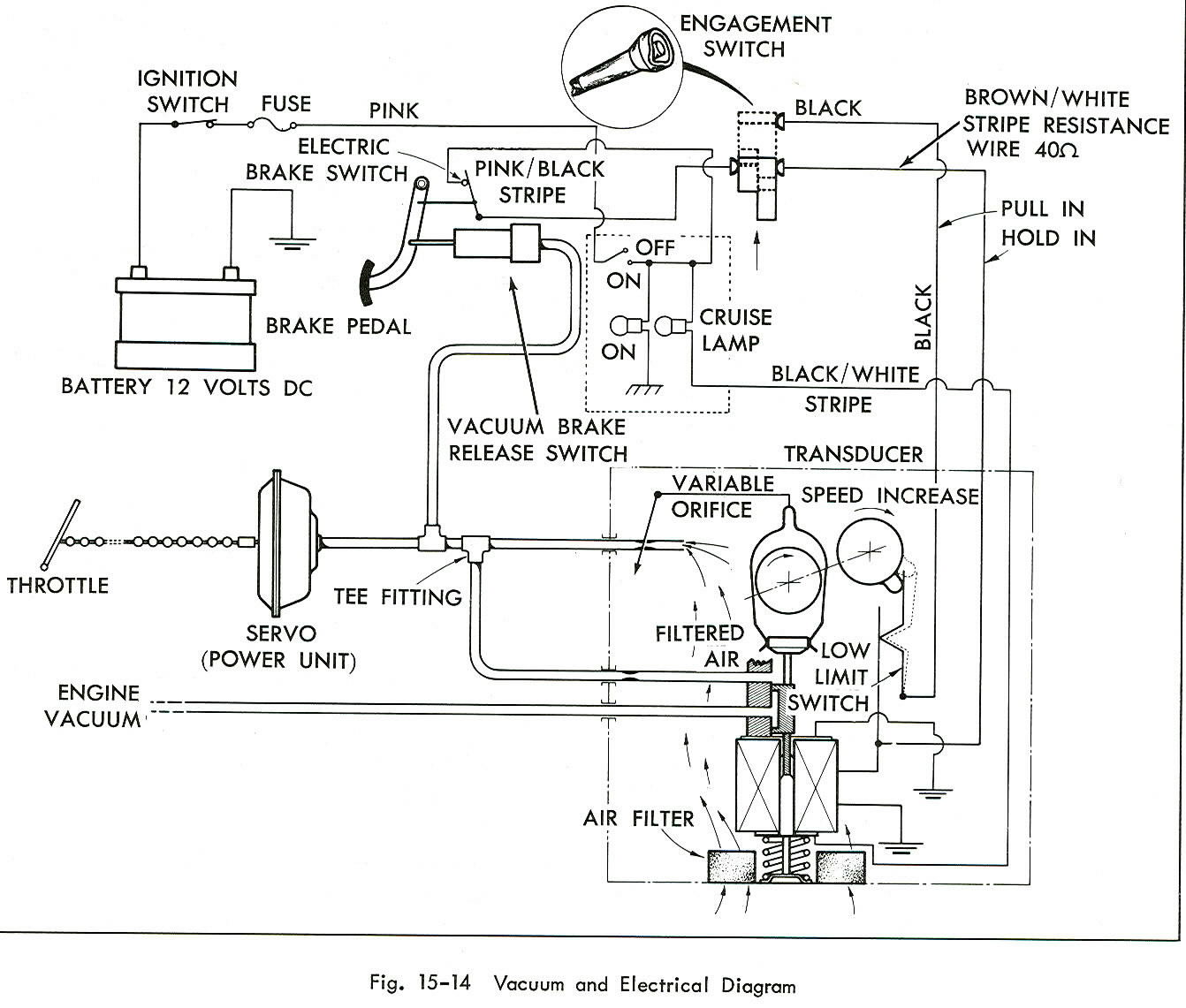 Power Unit .... Servo -- -- -- -- $58.00 Transducer 125.00 Wire harness -- -- -- -- 45.00 Throttle control rod assembly -- -- -- -- 65.00 Speedometer cable .........(servo to speedometer head) -- -- -- -- 45.00 Speedometer cable ........(servo to transmission) -- -- -- -- 55.00 Speedometer cable ........(servo to switch / controller) -- -- -- -- 55.00 Switch/controller with thumbwheel -- -- -- -- 125.00 Brake pedal switch -- -- -- -- 35.00 Complete cruise system .....(without chrome dash bezel) -- -- -- -- 500.00 illustration of cruise vacuum & electric diagram Ride leveling system