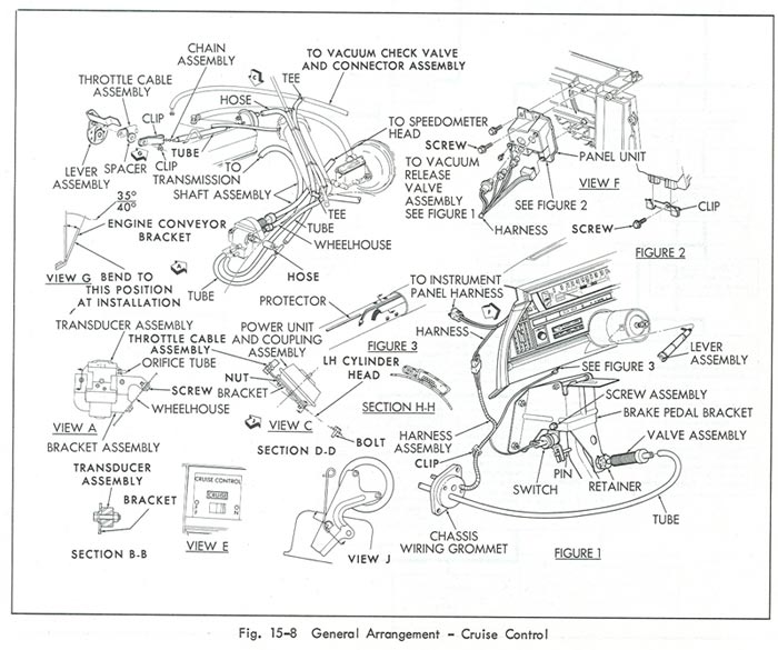 1. Turn signal arm with cruise button and wire ......(state color) -- -- $55.00 3. Vacuum release valve assembly -- -- 22.00 5. Stop light switch -- -- 22.00 8. Dash switch and wire harness -- -- 58.00 9. Dash switch escution -- -- 20.00 10. Cruise transducer ......(main controller) -- -- 125.00 17-19. Control chain -- -- 22.00 21. Speedometer cable ........(transducer to speedometer head) -- -- 32.00 23. Speedometer cable ........(transducer to transmission) -- -- 35.00 24. Power unit .......(servo) -- -- 58.00 -- Cruise wire harness including hold terminal resistance wire -- -- 65.00 ........(should read 40 ohms) Illustration for cruise system illustration of cruise vacuum & electric diagram Ride leveling system