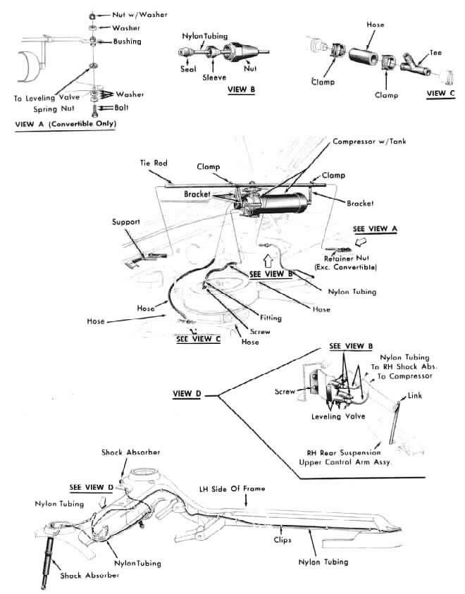 1. Leveling compressor assembly ........(good working -- -- -- -- $225.00 .........compressor, we completely disassemble several .........compressors, then reassemble using the best parts, ........then test thoroughly to make sure of dependable ........operation. Price does not include $55.00 core charge) 4. Shock absorber -- -- -- -- 95.00 6. Rear valve -- -- -- -- 125.00 Illustration of ride leveling system Windshield wipers