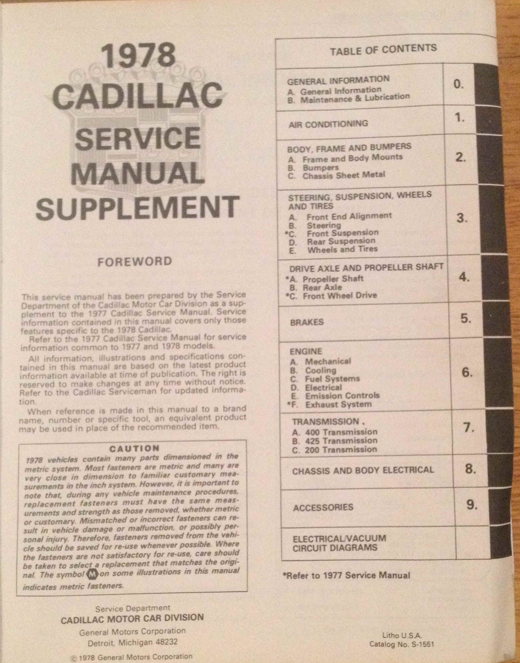 The 1978 Cadillac Service manual supplement has 402 pages. plus 3 large fold out electric wiring circuit diagrams, 1 large fold out engine vaccum circuit diagram, 1 large fold out accessory vaccum circuit diagram.