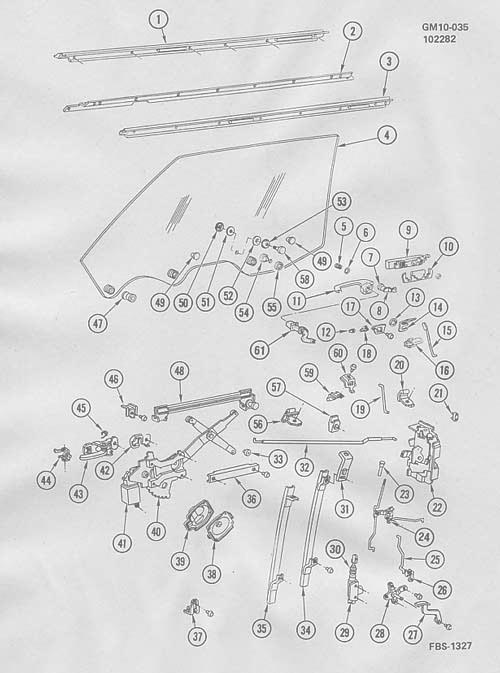 Left door shell .....(without moldings, Biarritz or coupe?) 150.00 175.00 195.00 Right door shell .....(without moldings, Biarritz or coupe?) -- -- 150.00 175.00 195.00 Biarritz door upper molding ......(big die cast piece, likes -- -- 100.00 125.00 150.00 .......to crack directly behind the narrow forward portion, and .......pit in black line) Door outboard window sweep ........(Biarritz, each side) -- -- -- -- 55.00 Door window/quarter window weather strip -- -- -- -- 55.00 Door window motor/regulator assembly ....(parts manual -- -- -- -- 125.00 ......shows only one style, 1979-1985, however we have found ......a second one, one type has six pins on the window switch ......the other style has five pins. The plugs on the motors are ......different) Rear view mirror .........(the following styles of rear view ......mirrors were available, manual remote non heated, ......manual remote heated, electric remote non heated, and ......electric heated. Please indicate which style you have ......when ordering. All mirrors same price.) Left door rear view mirror .......(non thermometer style) -- -- 75.00 95.00 125.00 Left door rear view mirror ......(thermometer style, without -- -- 75.00 95.00 125.00 .........thermometer) Right door rear view mirror -- -- 75.00 95.00 125.00 Rear view mirror thermometer -- -- -- -- 45.00 Door lower molding -- -- -- 35.00 45.00 Illustration of door hardware